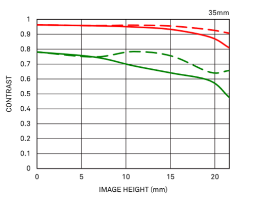 The MTF (Modulation Transfer Function) is one of the measurements for evaluating a lens’ performance, and it shows how faithfully the contrast of the subject can be reproduced on the image plane. The horizontal axis shows the image height (distance from the center of the image in mm) and the vertical axis shows the contrast value (maximum value is 1).